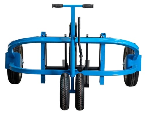 Transpaleta especial para obra y terrenos dificiles con ruedas neumáticas para una capacidad de car de 1.500 kg. Se adapta a todos los modelos de palet. Ancho de horquilla regulable de 190mm. a 590mm. exterior